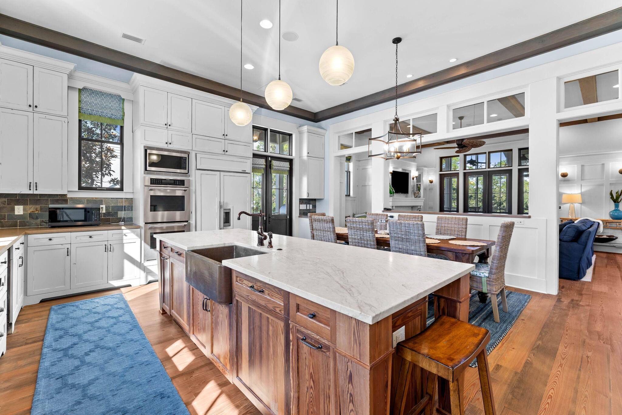 An exceptional WaterColor property, with all the trappings of a custom built home, welcome you to 459 Western Lake Drive. This large and tranquil home, conveniently located close to town center, was meticulously constructed replete with amenities. Spanning 3 stories served by an elevator, and a lookout tower, the home has no shortage of space. The main house features a master suite on the first level, as well as two additional guest rooms, and a bunk-style bedroom room for 3 or more.