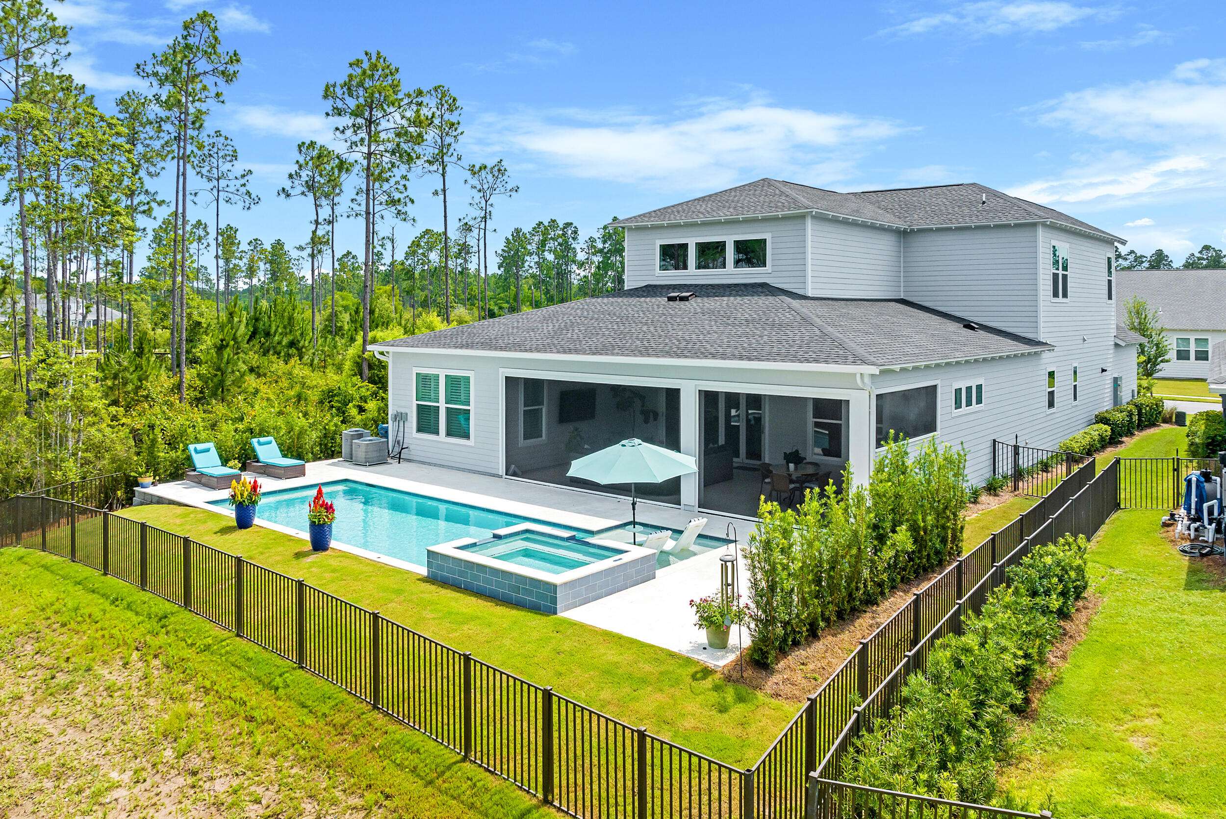 One of only five homesites in the community with rare privacy with serene wooded surroundings on two sides. Home has one of the largest pools and hot tubs in neighborhood. These motivated sellers are ready to move soon as they downsize into a new home in NatureWalk at Origins!Welcome to the Venice floor plan--an exceptional 5-bedroom, 4.5-bath home offering luxury, flexibility, and privacy, all ready for immediate move-in. Thoughtfully designed for multi-generational living, this home features two bedrooms on the main floor, including a spacious primary suite. The two-story living room is an architectural showstopper with a striking linear fireplace framed by floor-to-ceiling tile, creating a dramatic focal point that flows seamlessly into the outdoors.